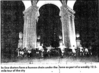 | Mob of skaters takes city by storm weekly BY SAM WHITING Chronk~ S~ff Wriler On a foggy Friday night, Dan Cunningham and Phyllis White are sharing a bottle of red beneath the Palace of Fine Arts dome. They have with them a wrapped birthday present and a sleeping bag. At 9:20, the first inline skater arrives like a scout for a swarm of killer bees. Another body on wheels rolls out of the dark, then another, and all at once there are 62 skaters whipping around the circle with arms linked in a long snake. "What is this," asks Cunningham, "roller derby night?" |